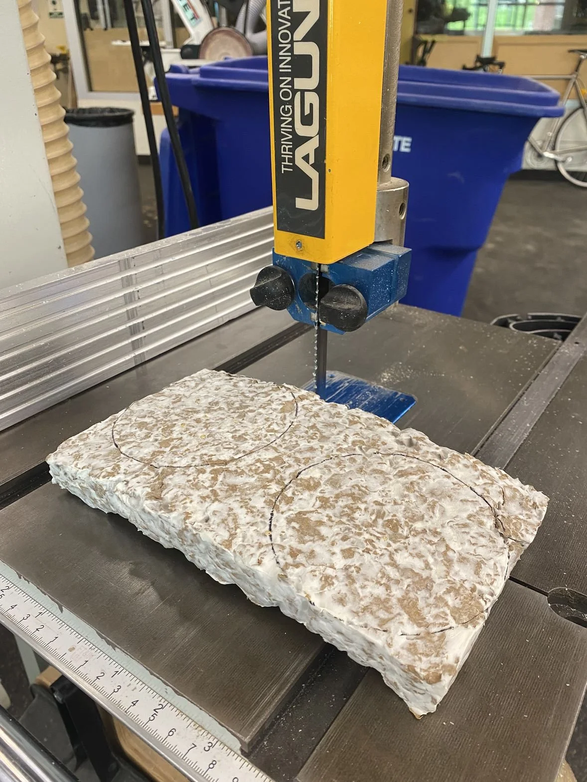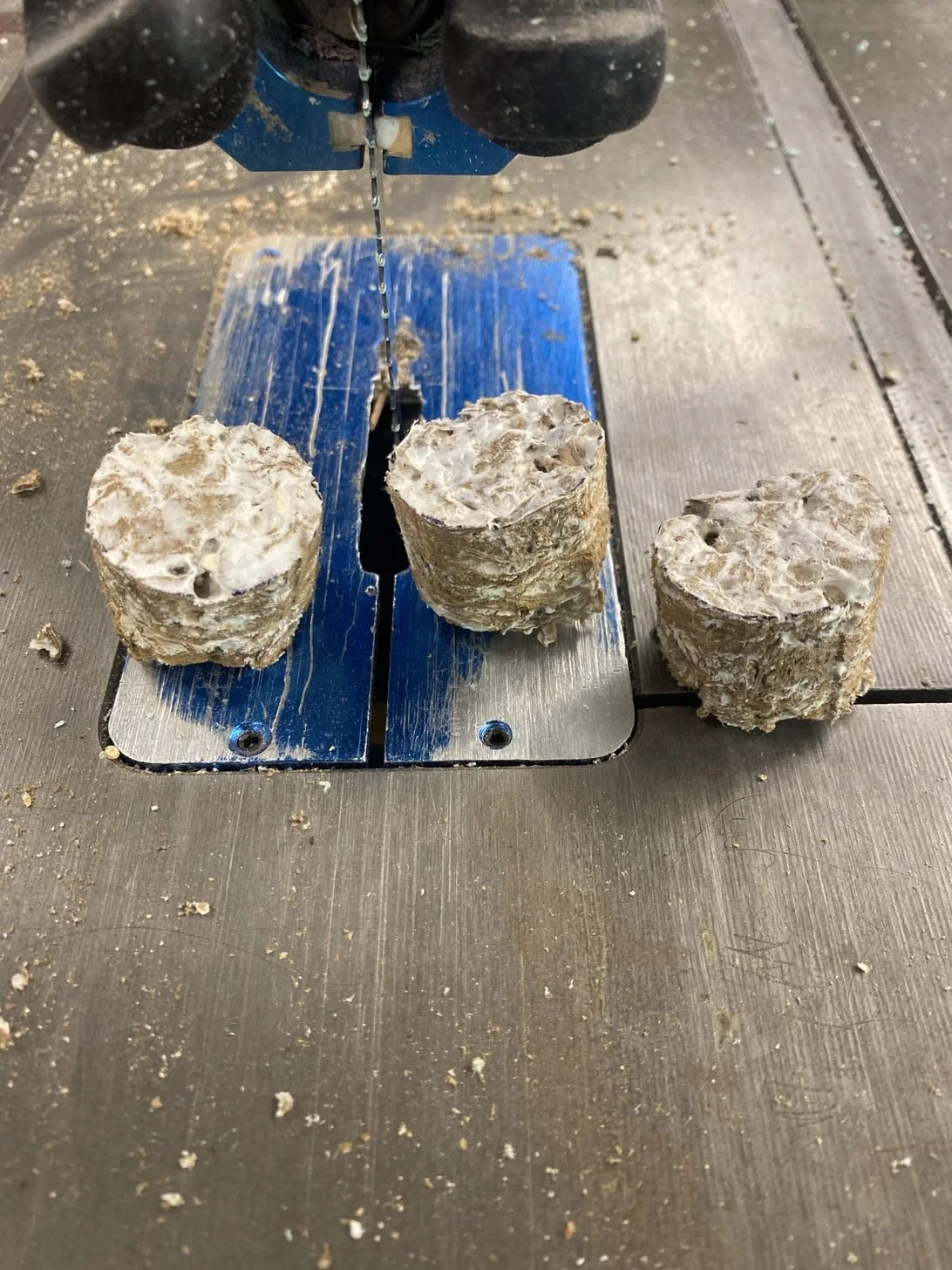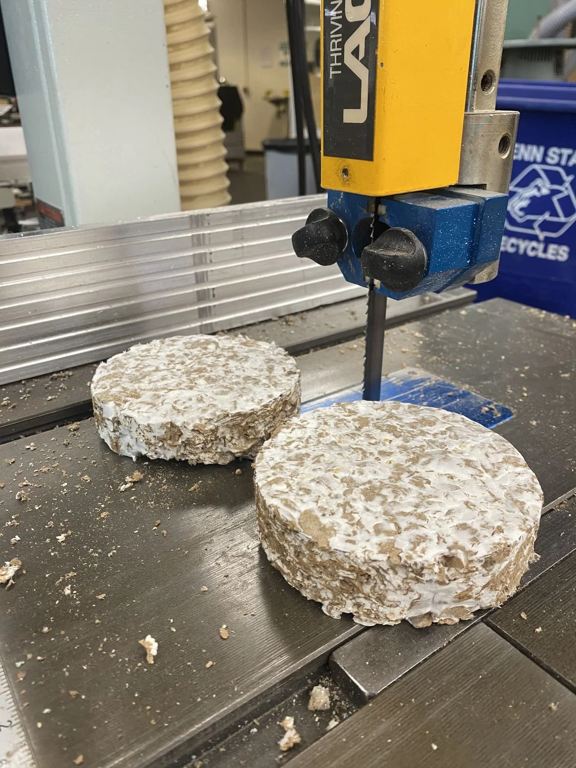 Material cultivation begins with substrate selection and preparation. The prepared substrates are then sterilized in an autoclave to mitigate contamination. Once sterilized, the materials are inoculated with P. ostreatus mycelium grown on cotton seed hulls and straw (spawn). These samples are left to grow in a controlled growth environment, first in autoclavable bags for 12 days and then in sterile formworks for 16 more days. Once grown, the samples are dried and heated in a 200 °F oven to kill the mycelium and stop the cultivation process. The samples are then shaped to fit into an impedance tube to test for sound absorption.